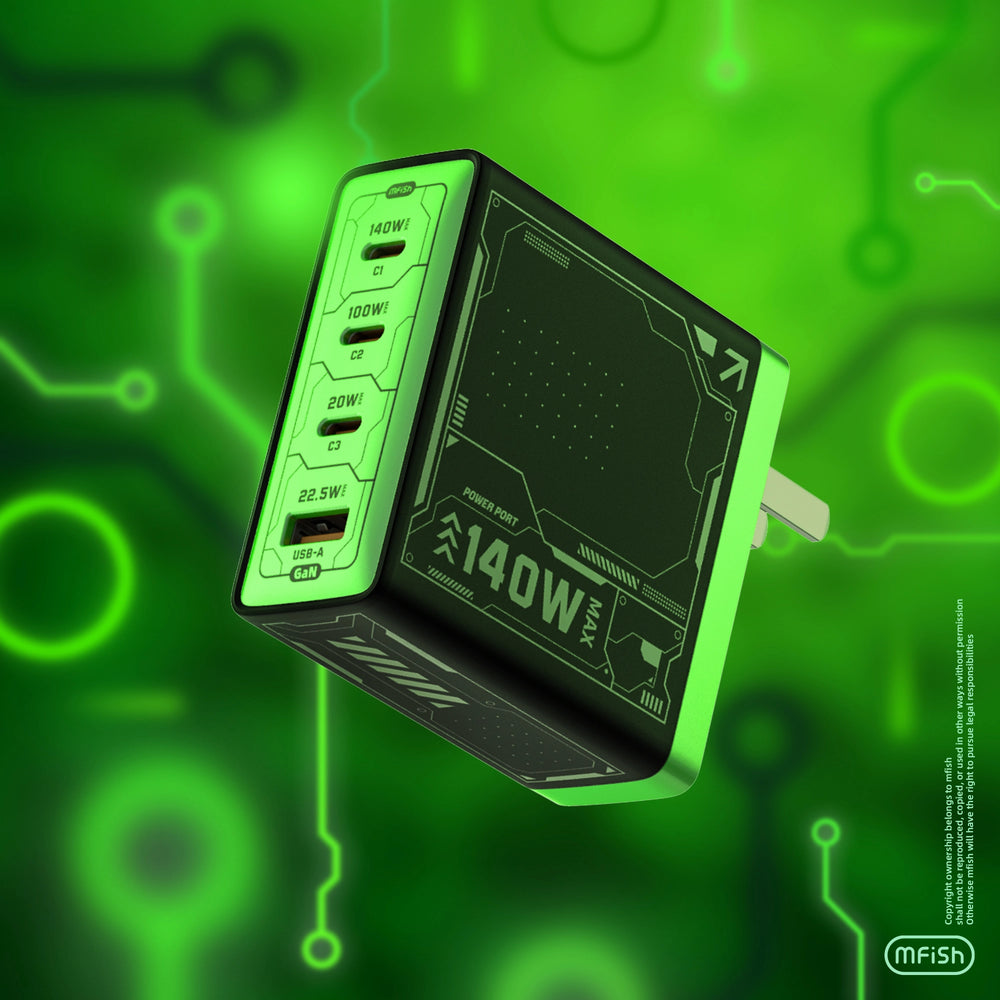 Discover the mfish E-RIHINO 140W GaN Charger, a compact powerhouse with three USB-C and one USB-A port, designed to charge your devices quickly and efficiently.